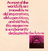 The opening page of the first issue of Avant Garde bore this dedication set in Avant Garde Gothic: As most of the world's ills are traceable to old imperatives,old superstitions, and old fools, this magazine exuberantly dedicated to the future.